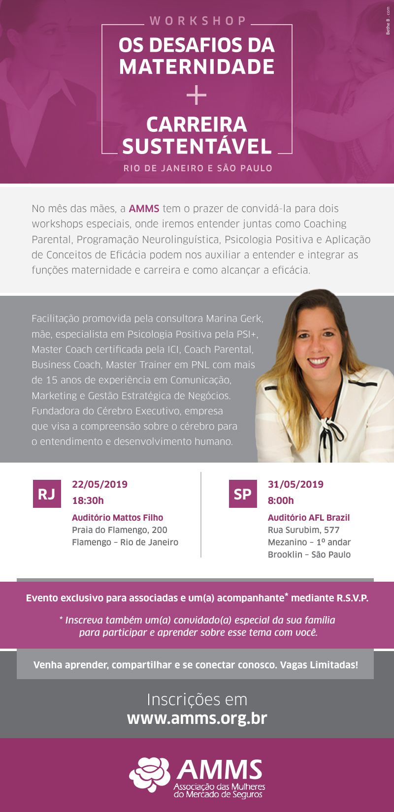No mês das mães a AMMS tem o prazer de convidá-la para um evento diferente, desenhado para trabalhar e praticar conceitos importantes que lhe ajudarão a melhor entender e integrar as funções maternidade e carreira, e como alcançar a eficácia.Vamos entender juntas como Coaching Parental, Programação Neurolinguistica, Psicologia Positiva e Aplicação de Conceitos de Eficácia podem nos auxiliar nessa jornada, através de um encontro com muita interação e conexão.Nosso objetivo nesse encontro é promover a conscientização do papel da mulher e mãe no mercado de trabalho, com base no fortalecimento da identidade feminina e da busca pela eficácia através do autoconhecimento, identificação de propósito e da linguagem.Venha aprender, compartilhar e se conectar conosco.Nós entendemos que a maternidade é um tema de família, e não só de mãe. Então, fique à vontade em inscrever também um(a) convidado(a) especial da sua família para participar e aprender sobre esse tema com você.Evento aberto para as profissionais do mercado e um(a) acompanhante mediante R.S.V.P.Duração: 08:00h às 11:00hProgramação:08:00h - Welcome coffee08:30h - Workshop10:30h - Encerramento e NetworkingAuditório AFL Brazil - Rua Surubim, 577 - Mezanino - 1º andar - Brooklin, São PauloIngresso Solidário: No dia do evento recolheremos doações em dinheiro em favor do projeto social Cervi - Centro de Reestruturação para a Vida de Diversas Mulheres de Várias Idades http://cervi.org.brVagas Limitadíssimas. Inscreva-se aqui!* Em caso de não comparecimento será cobrada uma taxa de R$50,00 em desfavor da profissional inscrita.