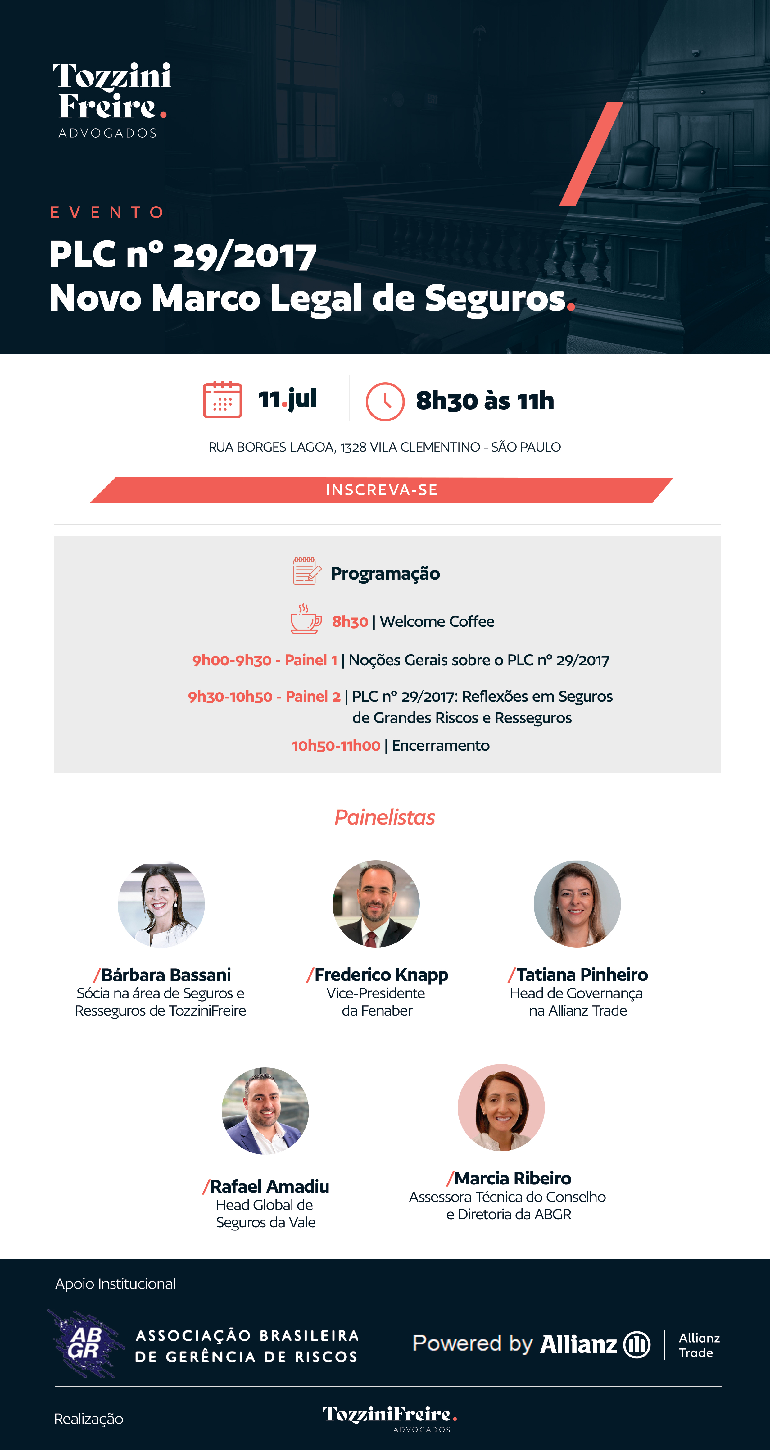 TozziniFreire Advogados, com o apoio institucional da ABGR (Associação Brasileira de Gerência de Riscos) e Allianz Trade, convida você e seu time para uma manhã de exposição seguida de importante reflexão quanto às principais disposições do PLC com impactos, especialmente, em seguros de grandes riscos e em resseguros, com a participação de painelistas que, gentilmente, cederam seu tempo para estarem conosco no debate.